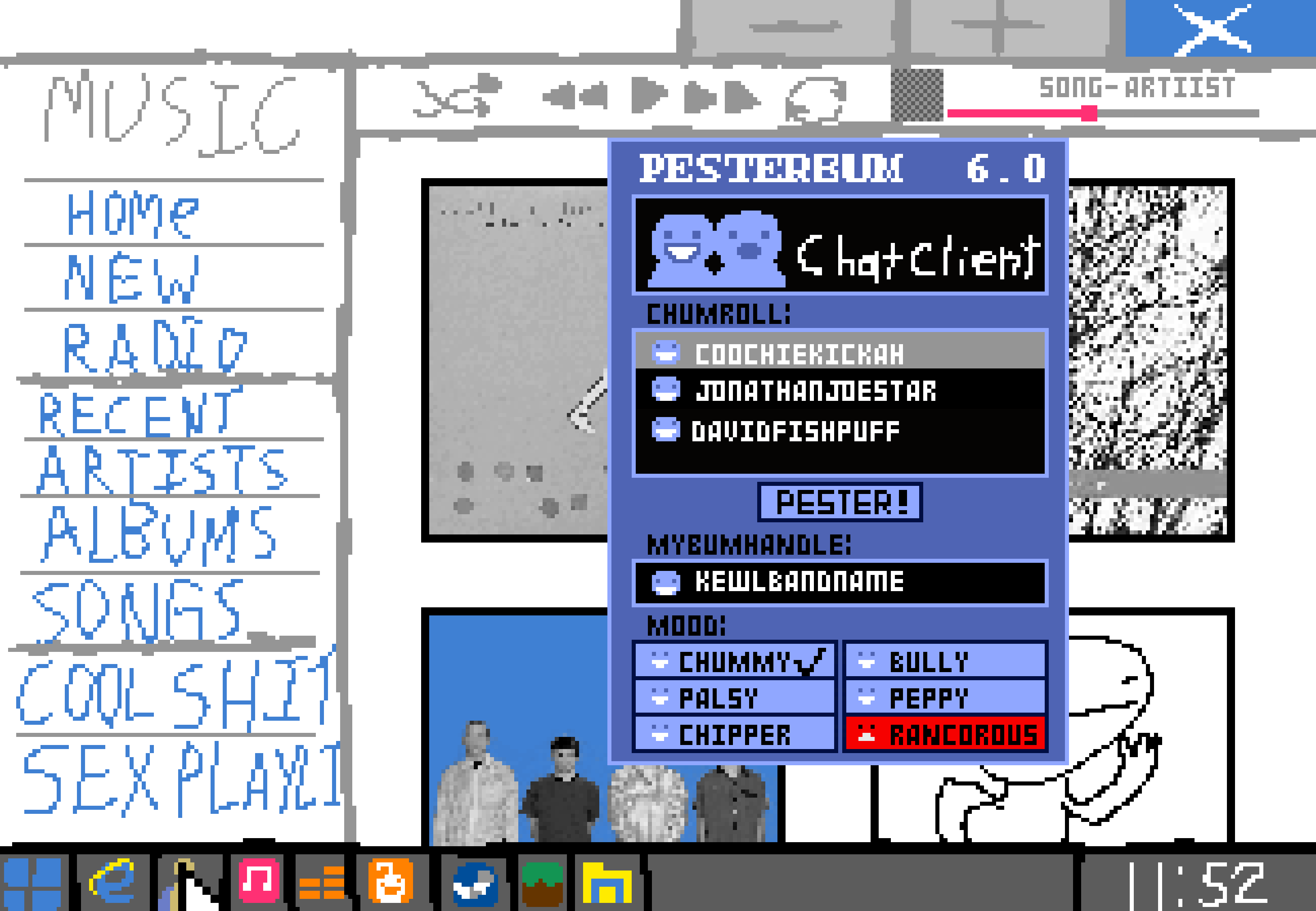 -- kewlBandname [KB] began pestering coochieKickah [CK] at 11:41